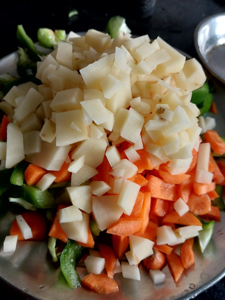 Now put chopped green chilies in it and cook all the vegetables covered for a while.